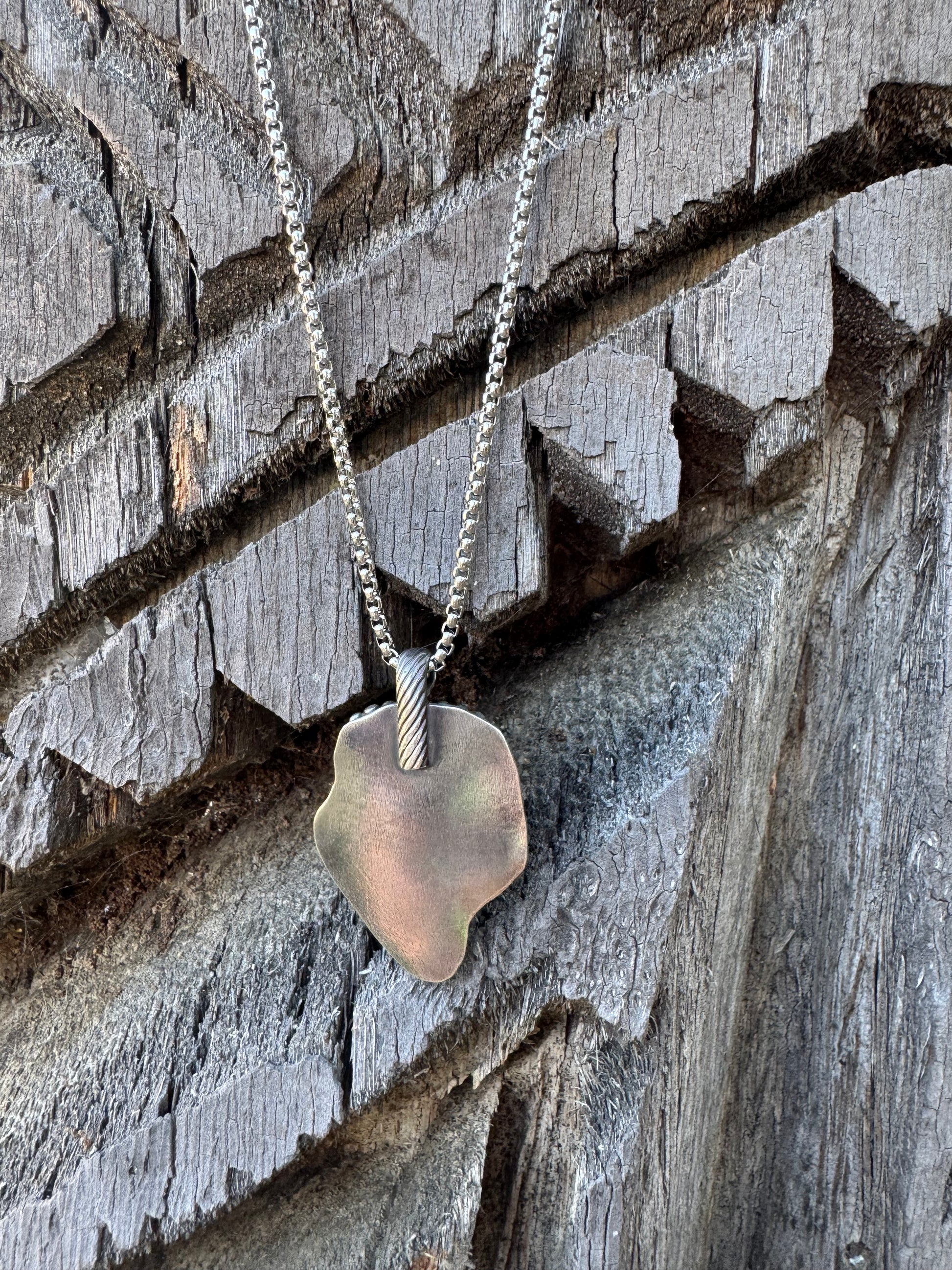 Stripped from a vintage #1 billiard ball and cut into a bold bolt shape — bright yellow, high contrast, and all attitude. Set in sterling silver with a chunky presence that doesn’t flinch. Hangs on a stainless steel box chain.
