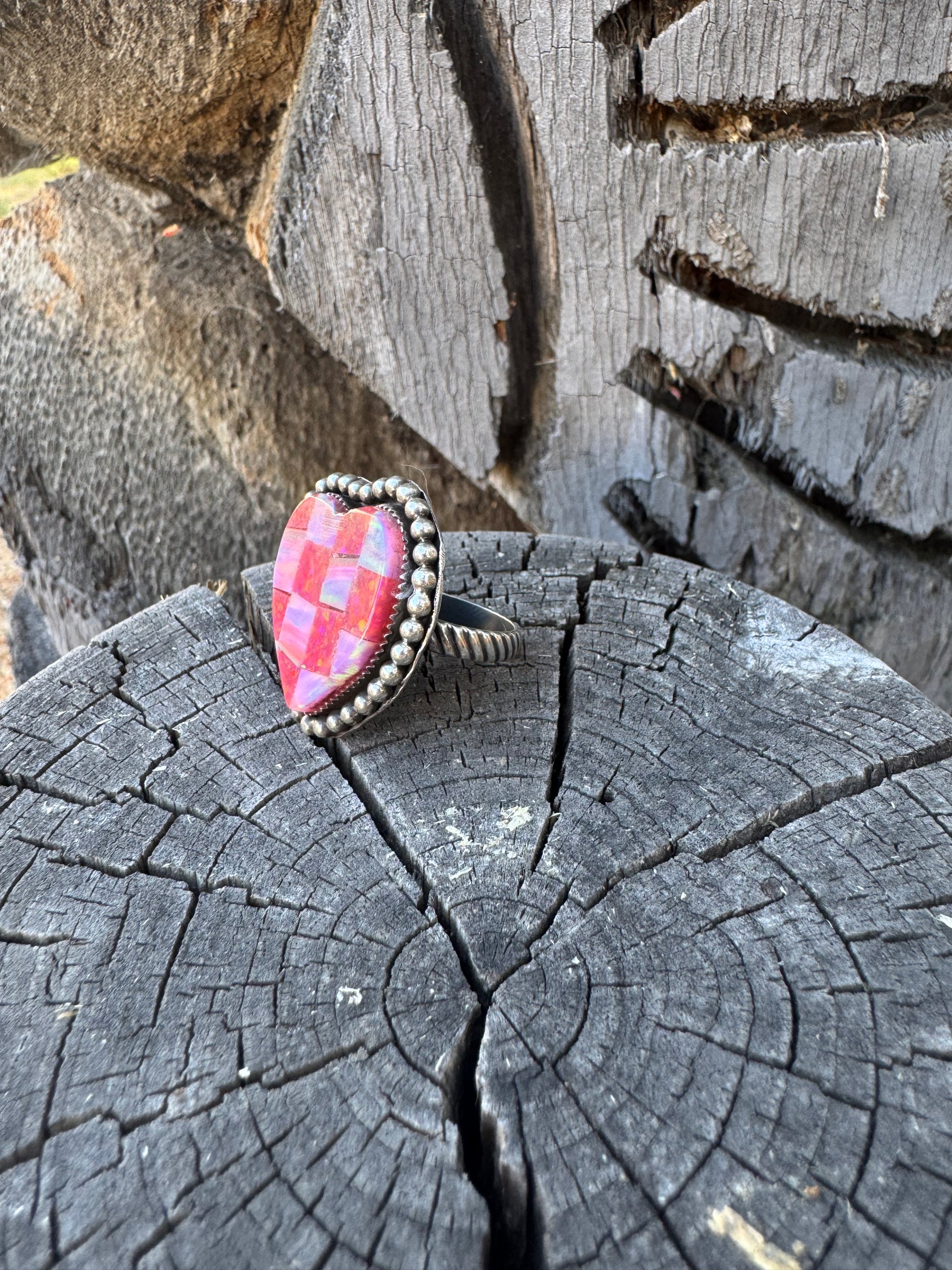 Cut by hand, shaped with intention. This custom-crafted heart ring features a double pink opal checkerboard that throws light in every direction — flashes of fire and softness in one. Set in sterling silver, every facet catches something different.