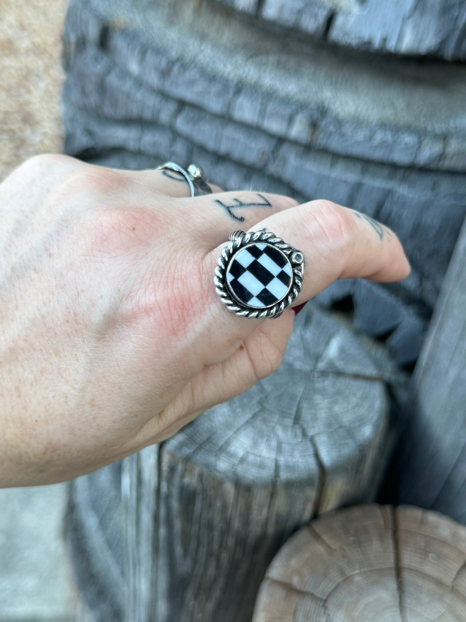 Bold and edgy with classic black and white stripes, this bolt ring combines clean lines with an electric vibe. Handcrafted, shaped and polished by hand.