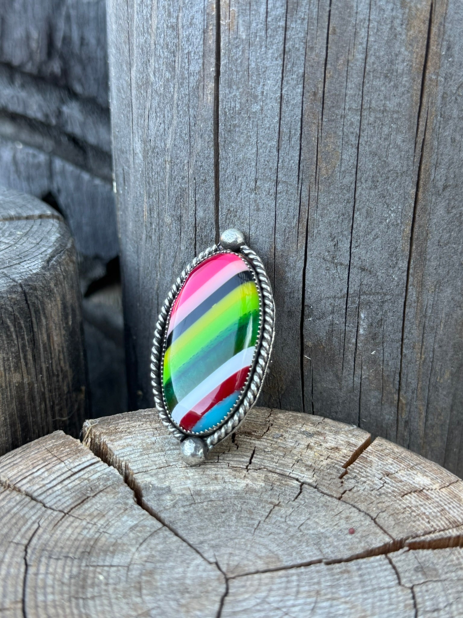 Bold, vibrant, and unmistakably handcrafted—a colorful large oval serape ring brings southwest flair to your everyday look. Featuring a bright serape-inspired design pattern, handmade, and capturing the woven texture and rich, layered colors of traditional Mexican textiles in a bold, statement ring.
